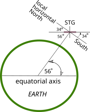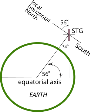 Fig 2 shows an STG, pivoted on an east west axis so that the plane of its rotation is parallel to the plane of Earth's equator. The City of Edinburgh where this experiment took place is at a latitude of 56 degrees north and the diagram shows that the STG has to be pivoted up to the south by 34 degrees from the local horizon.