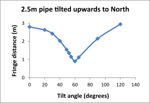 On Saturday 30th July 1994 in Newcastle, New South Wales, Australia Garry Kemlo [1] carried out some experiments in which he used a 2.5m long rectangular pipe arranged so that it could be tilted north at various angles. For each angle he then measured fringes on an east/west measurement track and got the results shown in figure 6. The curve has a striking resemblance to the plot in figure 1 but the minimum was obtained at an angle of 60°. |