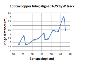 Figure 6 shows spacing results obtained from the arrangement of figure 4 but with 100cm long copper tubes. The upward expansion of the peaks at the right of the graph is much more pronounced than for the 60 cm tubes. It still shows local peaks at multiples of 21.1cm