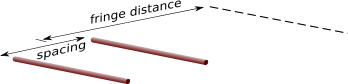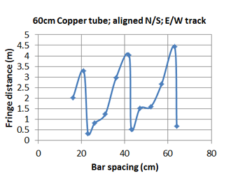 Similar peaks to those in figures 1, 2 and 3 can be observed by changing the spacing of the tubes in an interferometer. Figure 4 shows an arrangement of two 60cm long 13mm diameter copper service tubes. These are laid on the ground parallel to one another and the spacing between them incremented. Measurements of the fringe distance from the midpoint of the bars to the position of the detected fringe are made at each increment.