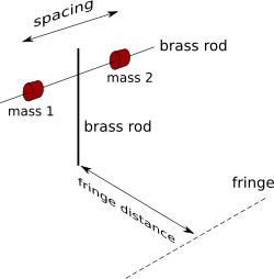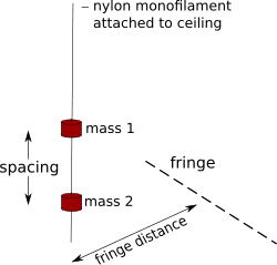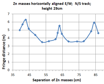 The spacing between the masses was increased in increments from 5 to 95 cm. At each increment the fringe was located using detector rods and the fringe distance measured.