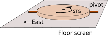 Fig 2 shows an STG, pivoted on an east west axis so that the plane of its rotation is parallel to the plane of Earth's equator. The City of Edinburgh where this experiment took place is at a latitude of 56 degrees north and the diagram shows that the STG has to be pivoted up to the south by 34 degrees from the local horizon.