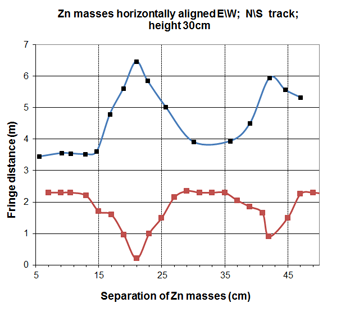 The spacing between the masses was increased in increments from 5 to 95 cm. At each increment the fringe was located using detector rods and the fringe distance measured.